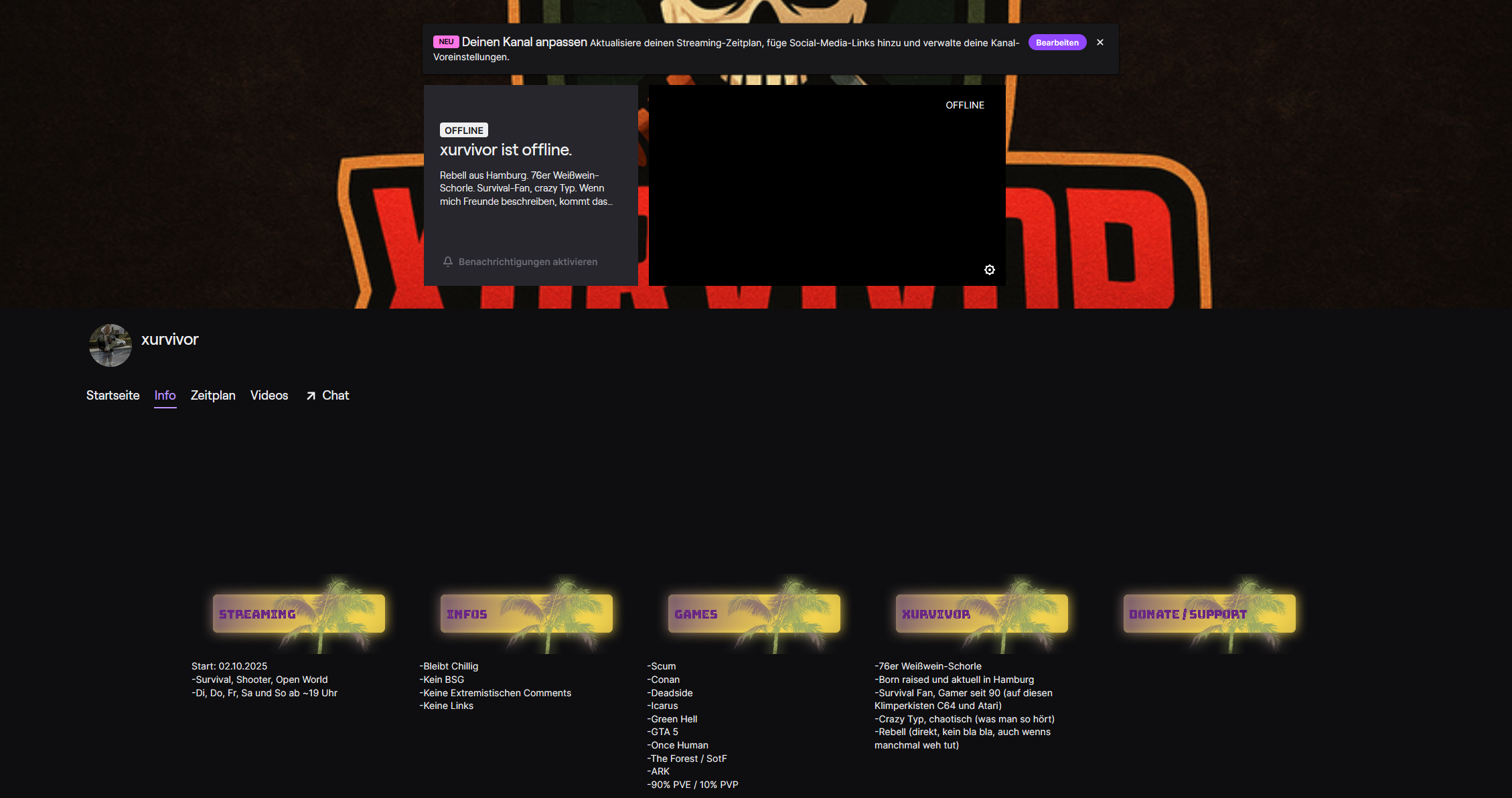 Seit den 90er-Jahren eigentlich immer am zocken, mal mehr, mal weniger, mal gar nicht. Die letzten 4 Jahre eigentlich immer öfter, und durch einen ziemlich bekannten Streamer auf Survival-Games gestoßen. Warum? Weil es bei ihm immer so einfach aussah! Bei The Forest immer auf die Fresse bekommen, kurz vorm aufgeben, und da kam wieder das Motto: Mach es!
